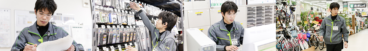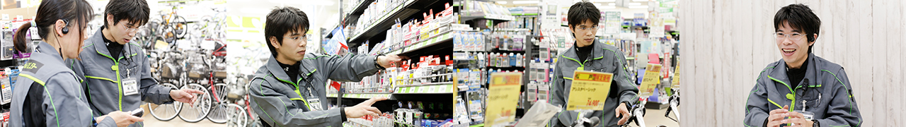 副店長)として、「エンジョイ部門」を任されています。同部門ではカー用品・レジャー用品から、文具、自転車、ペット(犬・猫・魚・小動物)およびその他というように非常に幅広い商品を扱っています。この仕事は想像以上に「クリエイティブ」。一つひとつの売場を“演出”し、お客様に見ていただいて、買っていただくには、それこそ創造力が不可欠です。商品部から基本的な売り方の提案はありますが、それをそのまま実施するのは面白くない。自分なりに売場を工夫して創ってみたいと思うんです。もちろん店長の許可は必要です。そのうえで部門長としての力量を発揮するのが、この仕事の醍醐味です。